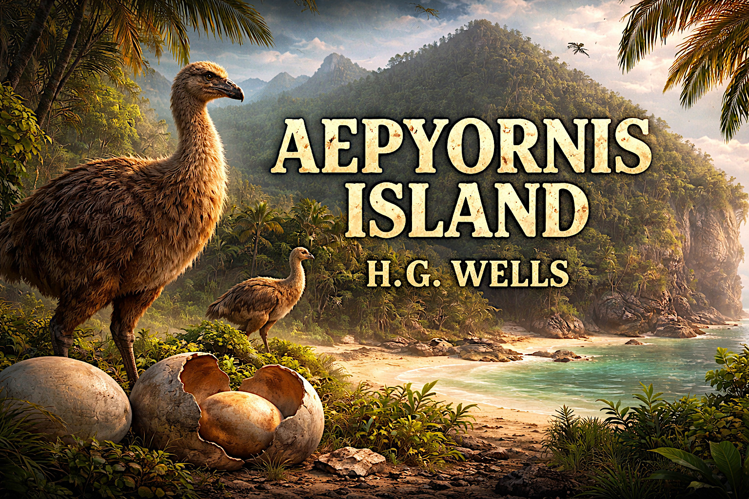 “You’d be surprised what an interesting bird that Aepyornis chick was. He followed me about from the very beginning. He used to stand by me and watch while I fished in the lagoon, and go shares in anything I caught. And he was sensible, too. There were nasty green warty things, like pickled gherkins, used to lie about on the beach, and he tried one of these and it upset him. He never even looked at any of them again.