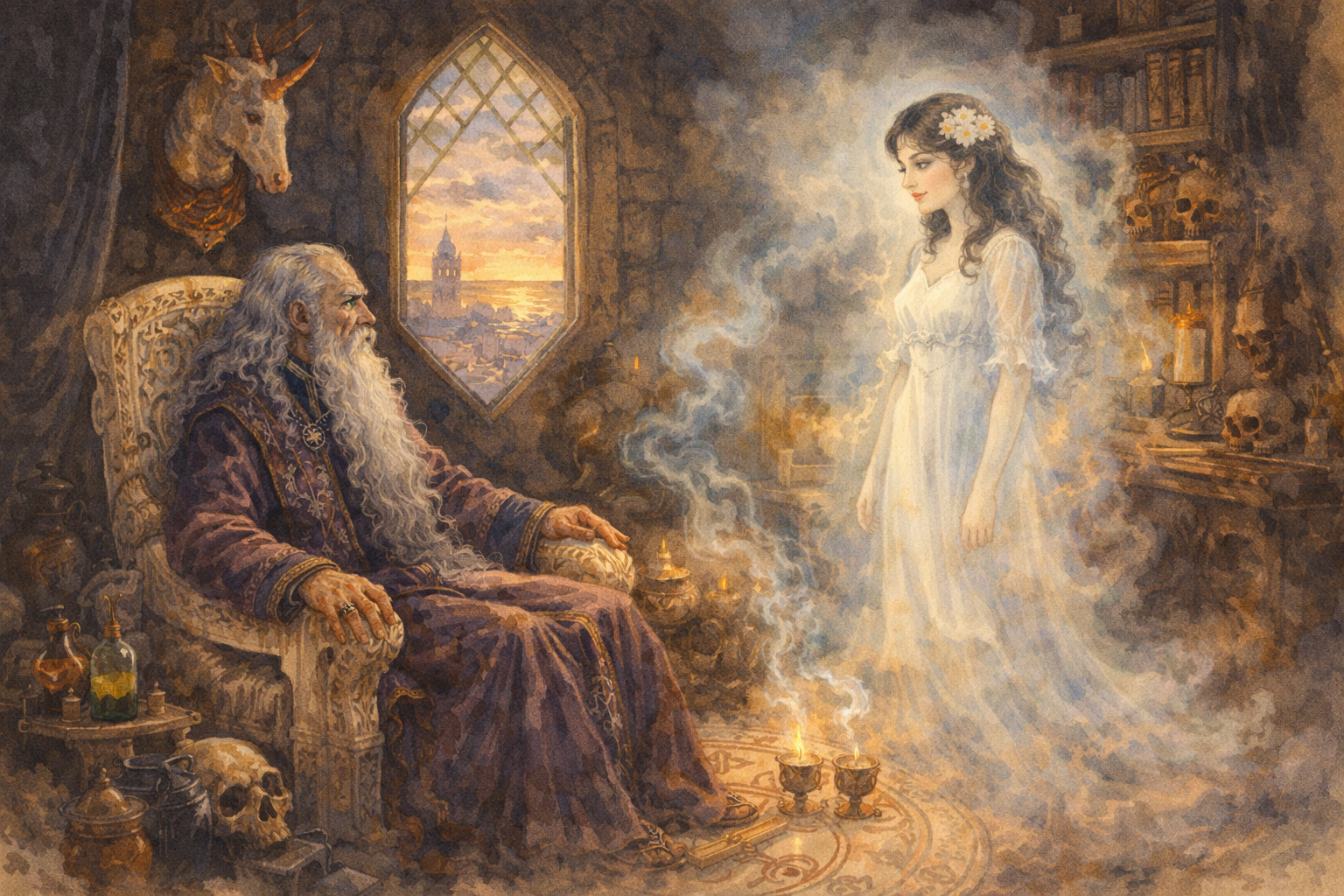 In accents that were thin and quavering, like the ghost of his former voice, he pronounced the incantation that serves to dismiss a summoned phantom. The form of Nylissa melted upon the air like smoke and the lunar gleam that had surrounded her was replaced by the last rays of the sun. Malygris turned to the viper and spoke in a tone of melancholy reproof: “Why did you not warn me?”
